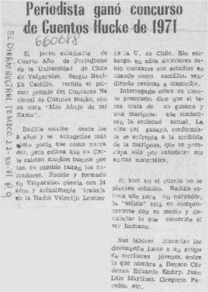 Periodista ganó concurso de Cuentos Hucke de 1971. [artículo]