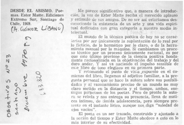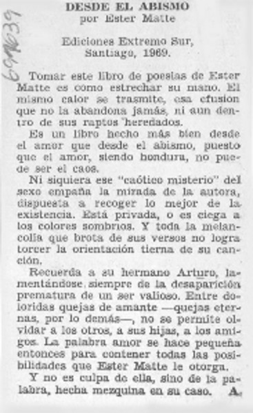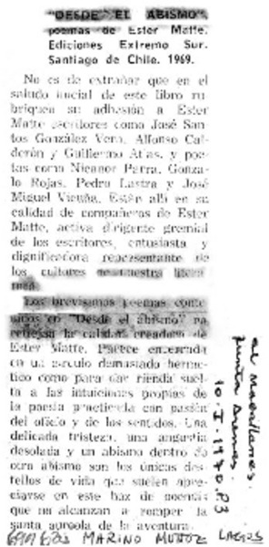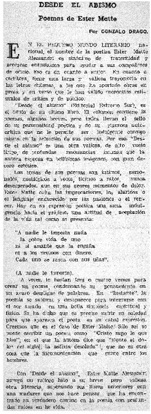 "Desde el abismo" Poemas de Ester Matte [artículo] Marino Muñoz Lagos.