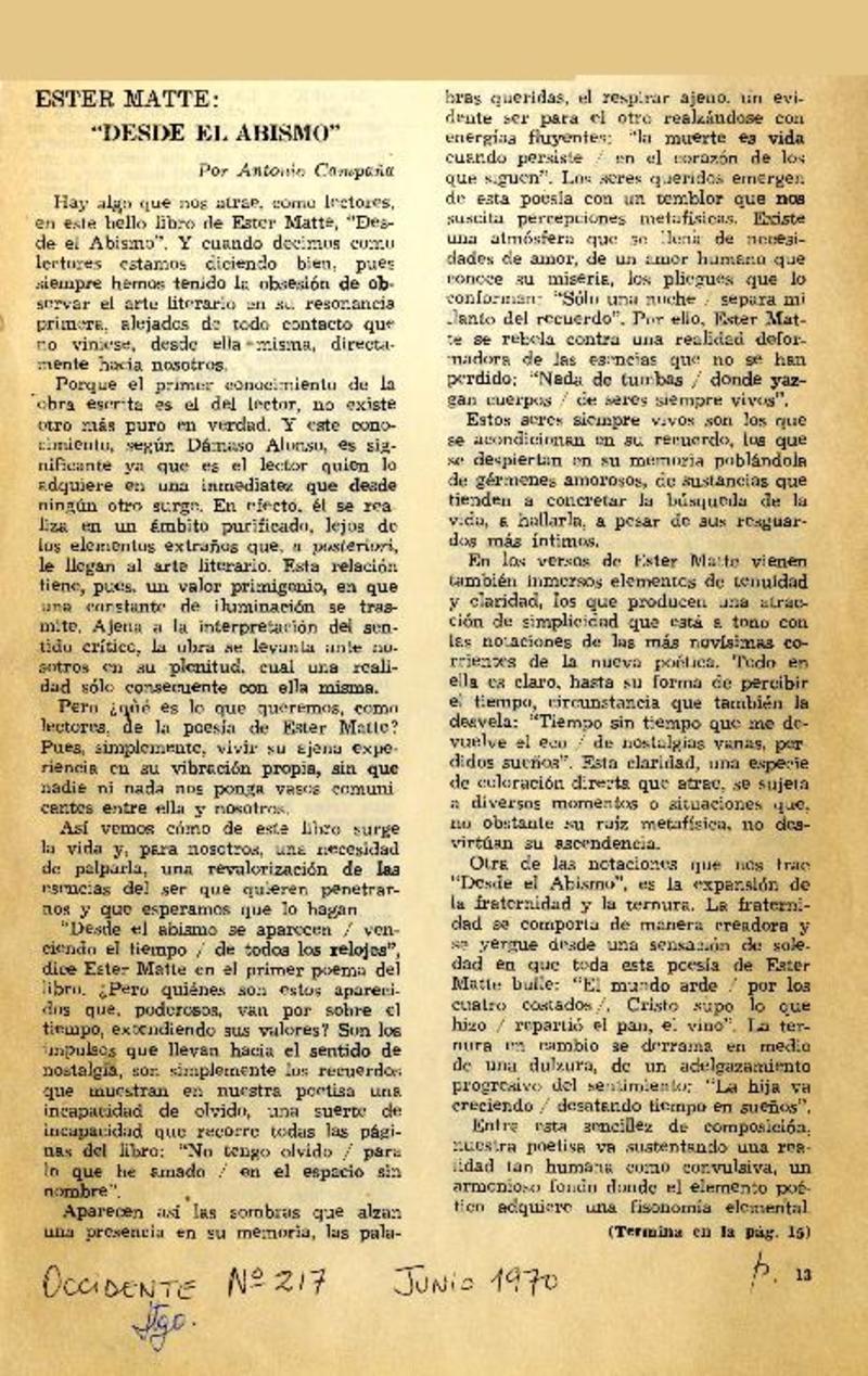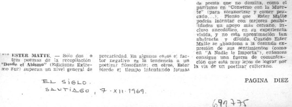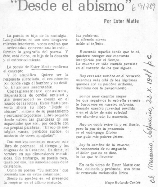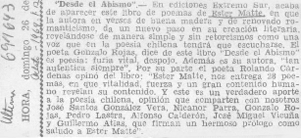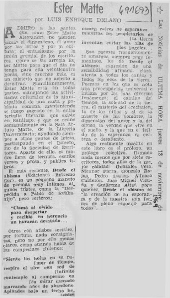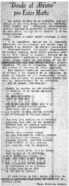 "Desde el abismo", por Ester Matte [artículo] Hugo Rolando Cortés.