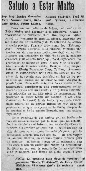 Saludo a Ester Matte [artículo] José Santos González Vera ...[et. al].