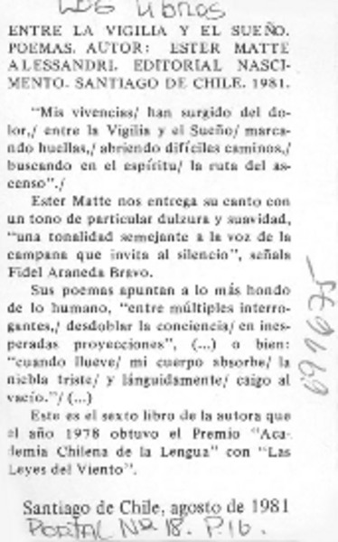 Autores chilenos - Matte, Ester - Entre la vigilia y el sueño