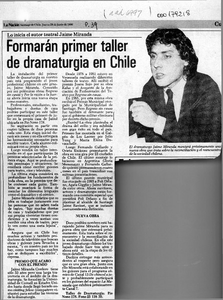 Formarán primer taller de dramaturgia en Chile [artículo].