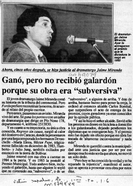 Ganó, pero no recibió galardón porque su obra era "subversiva" [artículo].