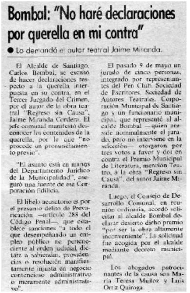 Bombal: "No haré declaraciones por querella en mi contra". [artículo]