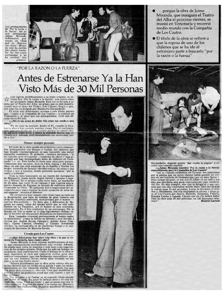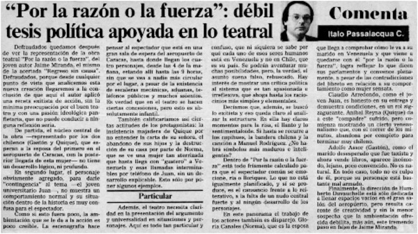Por la razón o la fuerza", débil tesis política apoyada en lo teatral [artículo] Italo Passalacqua C.