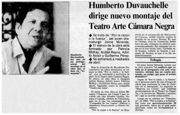 Humberto Duvauchelle dirige nuevo montaje del teatro arte cámara negra. [artículo]