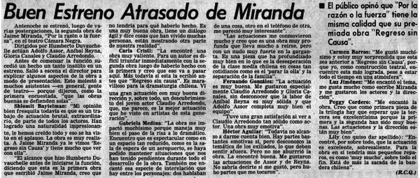 Buen estreno atrasado de Miranda [artículo] R. C. Q.
