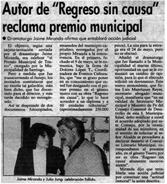 Autor de "Regreso sin causa" reclama premio municipal. [artículo]
