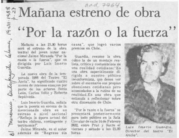 Mañana estreno de obra "Por la razón o la fuerza" [artículo].