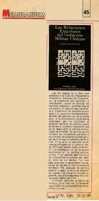 "Las relaciones exteriores del gobierno militar chileno" [artículo] C. S.