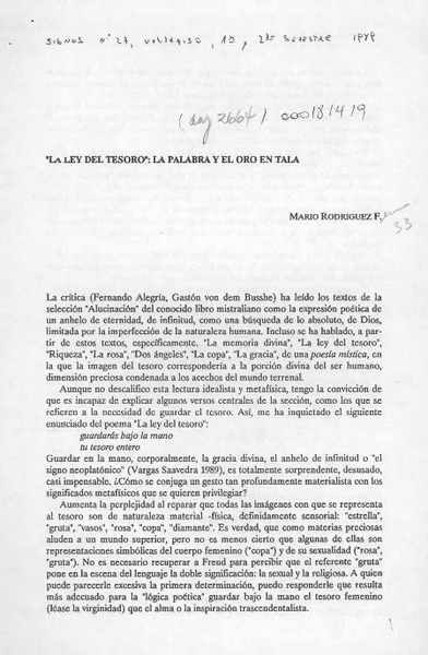 "La ley del tesoro", la palabra y el oro en "Tala" [artículo] Mario Rodríguez F.