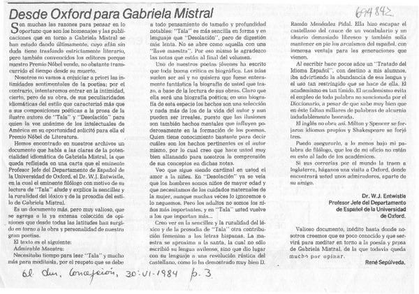 Desde Oxford para Gabriela Mistral [artículo] W.J. Entwistle.