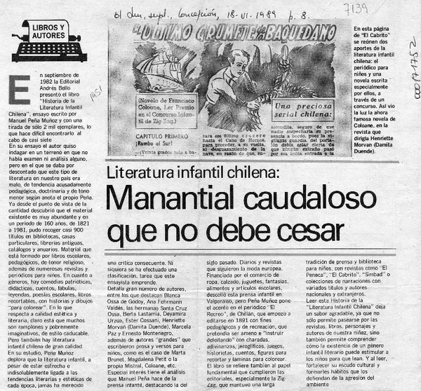 Literatura infantil chilena, manantial caudaloso que no debe cesar [artículo].