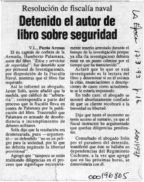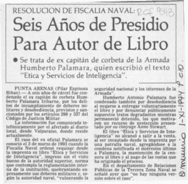 Capitán Palamara apela de sanción por su libro [artículo] Hernán Cisternas Arellano.