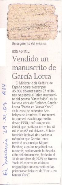 Vendido un manuscrito de García Lorca [artículo].