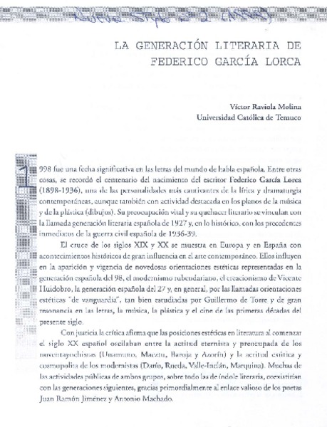 La generación literaria de Federico García Lorca [artículo] Víctor Raviola Molina.