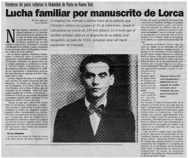 Lucha familiar por manscrito de Lorca. [artículo]