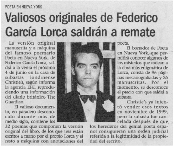Valiosos originales de Federico García Lorca saldrán a remate. [artículo]