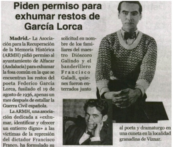 Piden permiso para exhumar restos de García Lorca. [artículo]