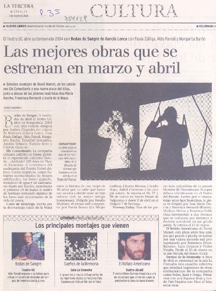 Las mejores obras que se estrenan en marzo y abril El Teatro UC abre su temporada 2004 con Bodas de Sangre de García Lorca con Paula Zuñiga, Aldo Parodi y Margarita Barón [artículo] : Rodrigo Miranda C.