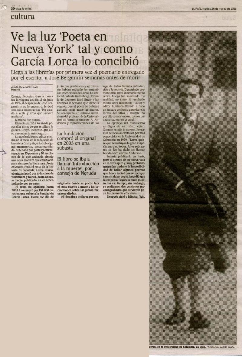 Ve la luz "Poeta en Nueva York" tal y como García Lorca lo concibió [artículo] Jesús Ruiz Mantilla.