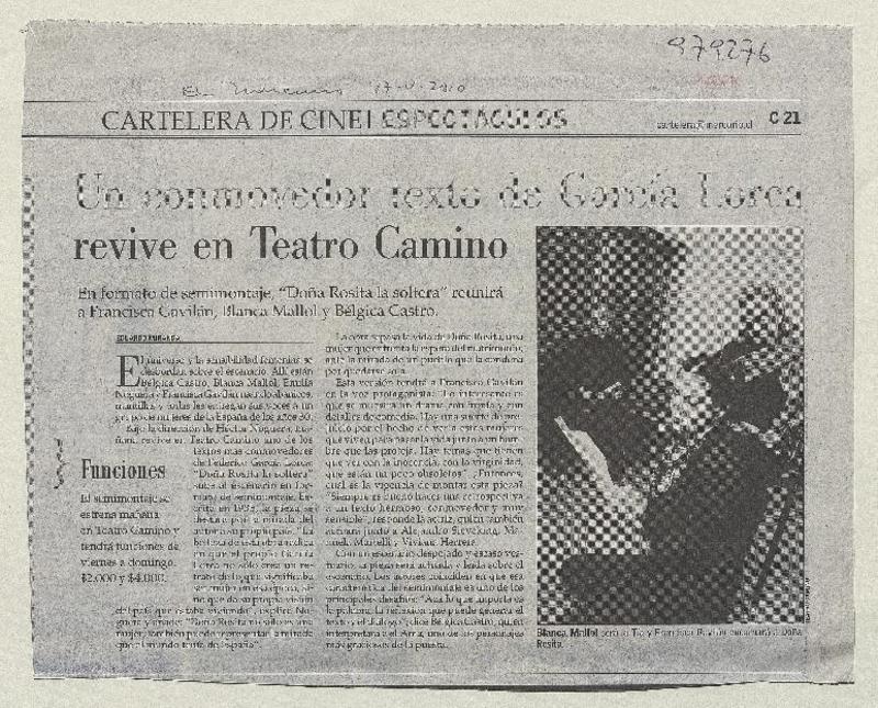 Un conmovedor texto de García Lorca revive en Teatro Camino [artículo] Eduardo Miranda.
