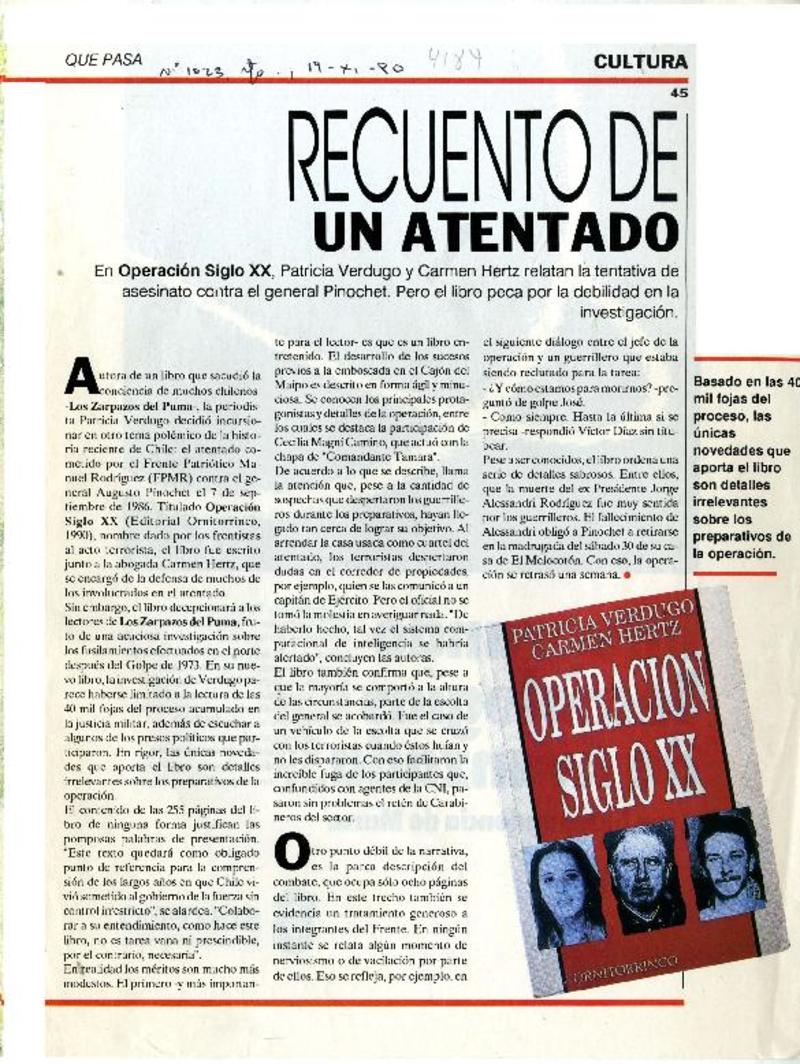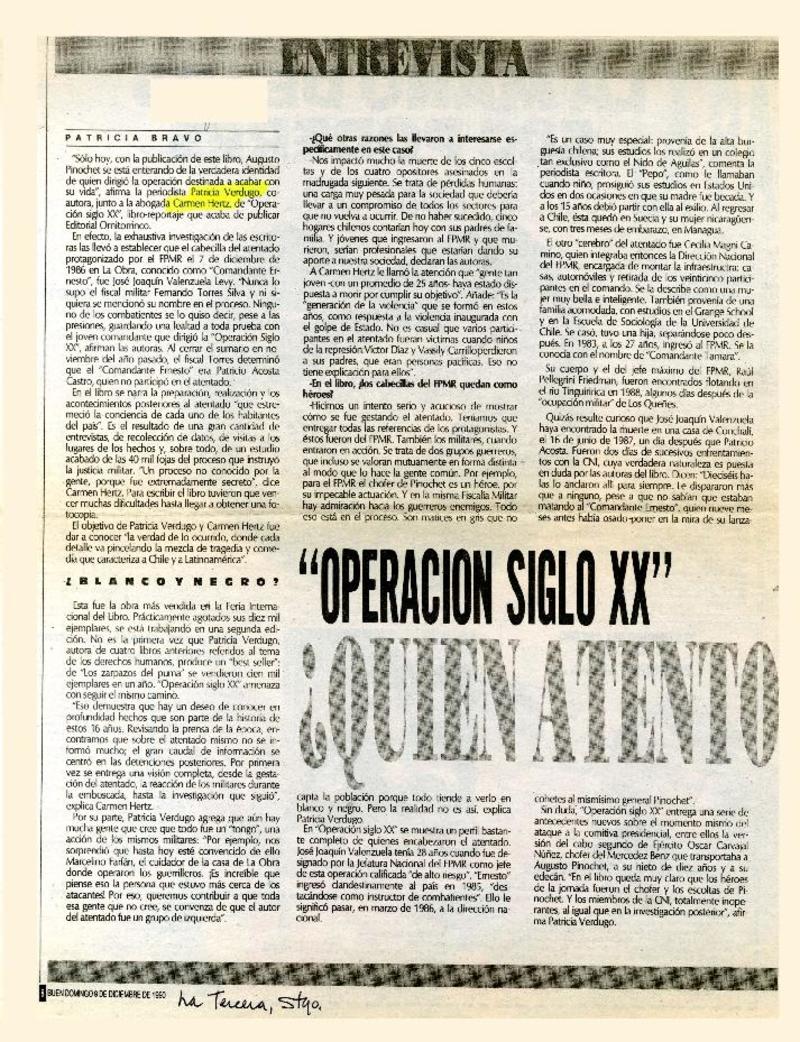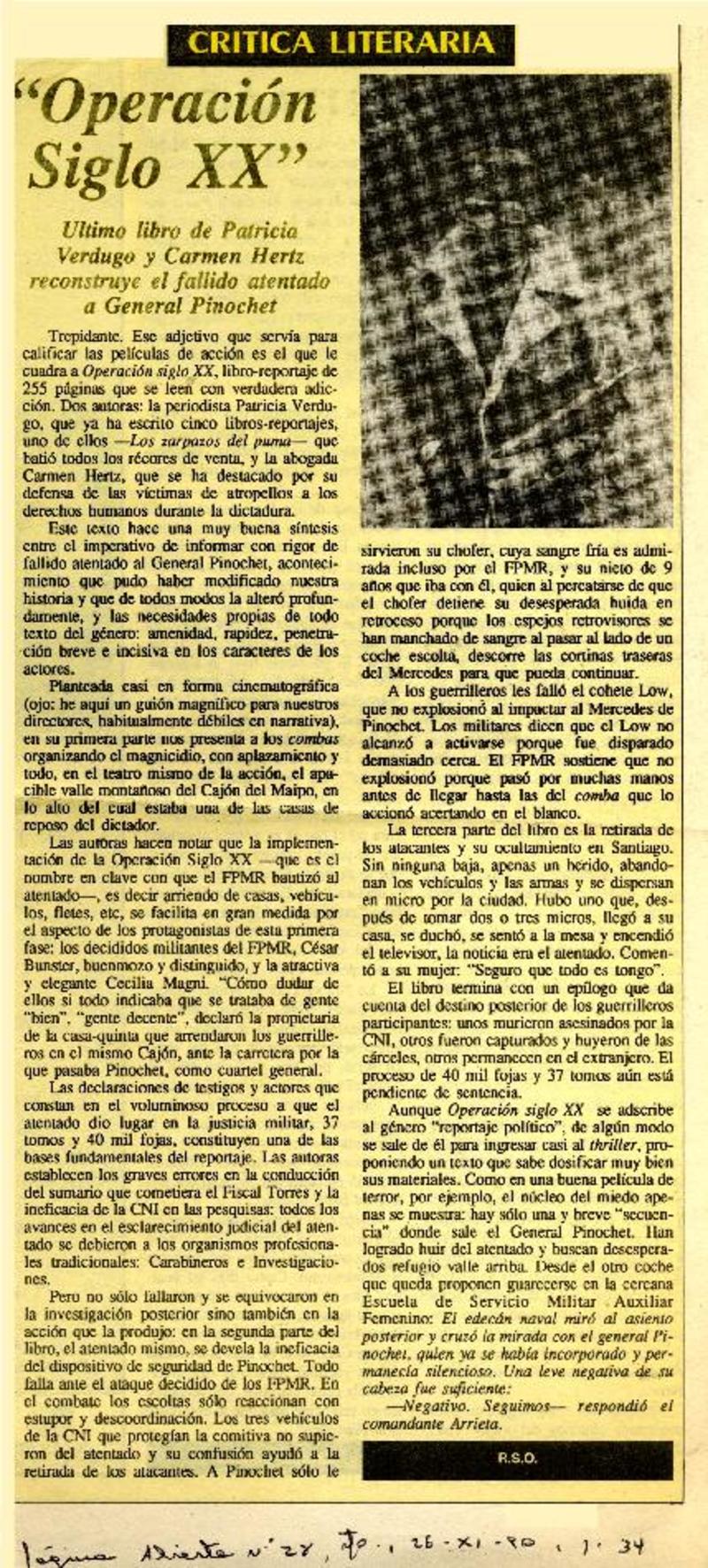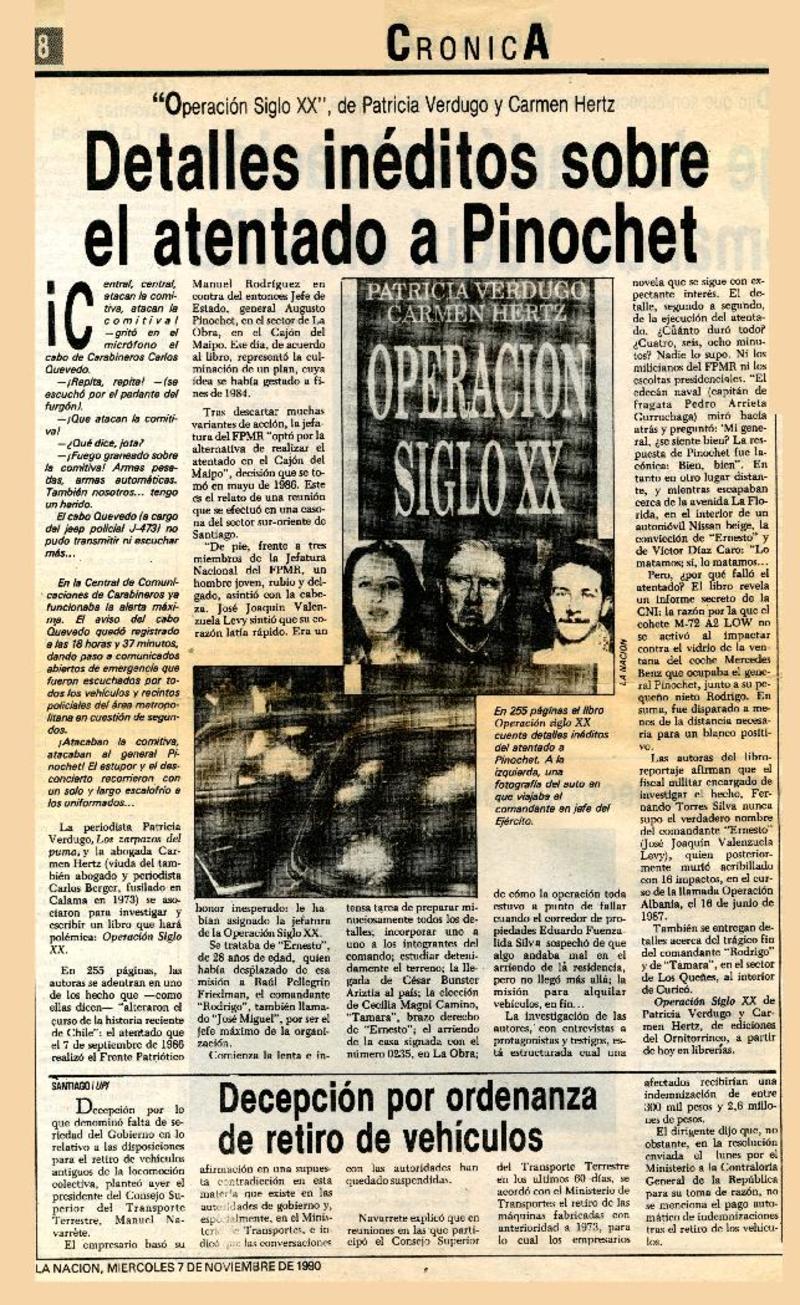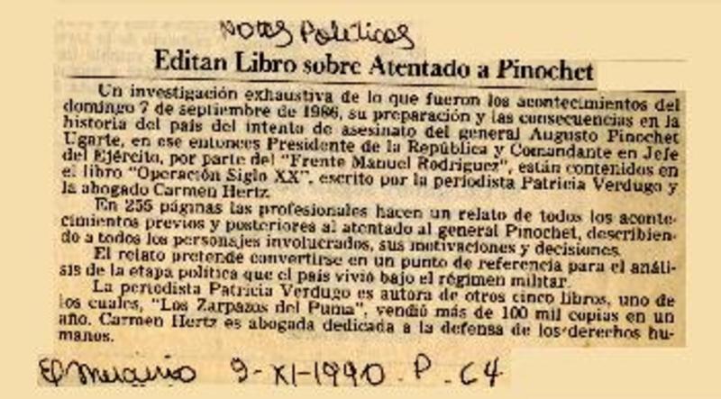 "Operación Siglo XX", Quién atentó contra Pinochet? [artículo] Patricia Bravo.
