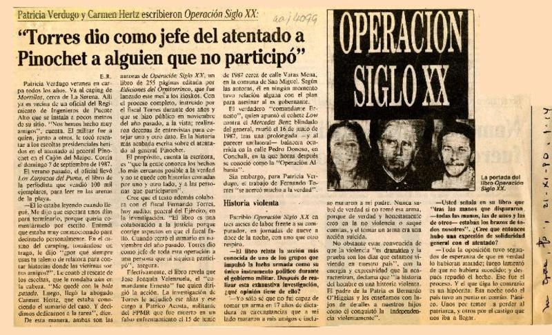 "Torres dio como jefe del atentado a Pinochet a alguien que no participó" [artículo] E. R.