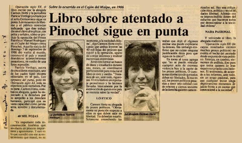 Libro sobre atentado a Pinochet sigue en punta [artículo].