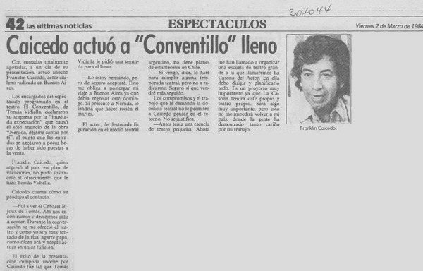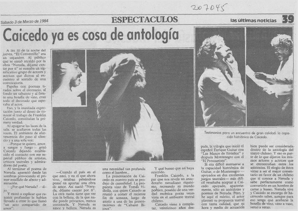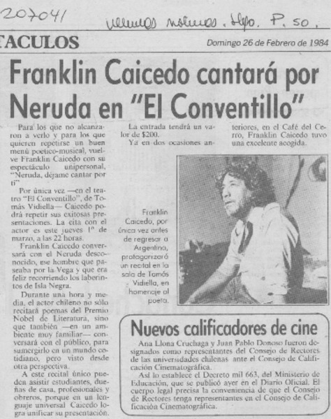 Franklin Caicedo cantará por Neruda en El Conventillo [artículo].