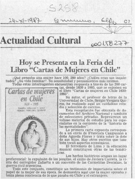 Hoy se presenta en la Feria del libro "Cartas de mujeres en Chile" [artículo].