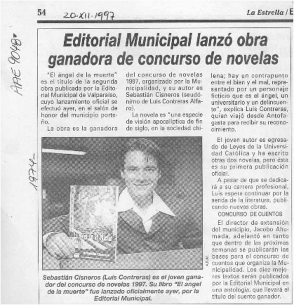 Angel gana concurso de novela [artículo] Alvaro Inostroza.