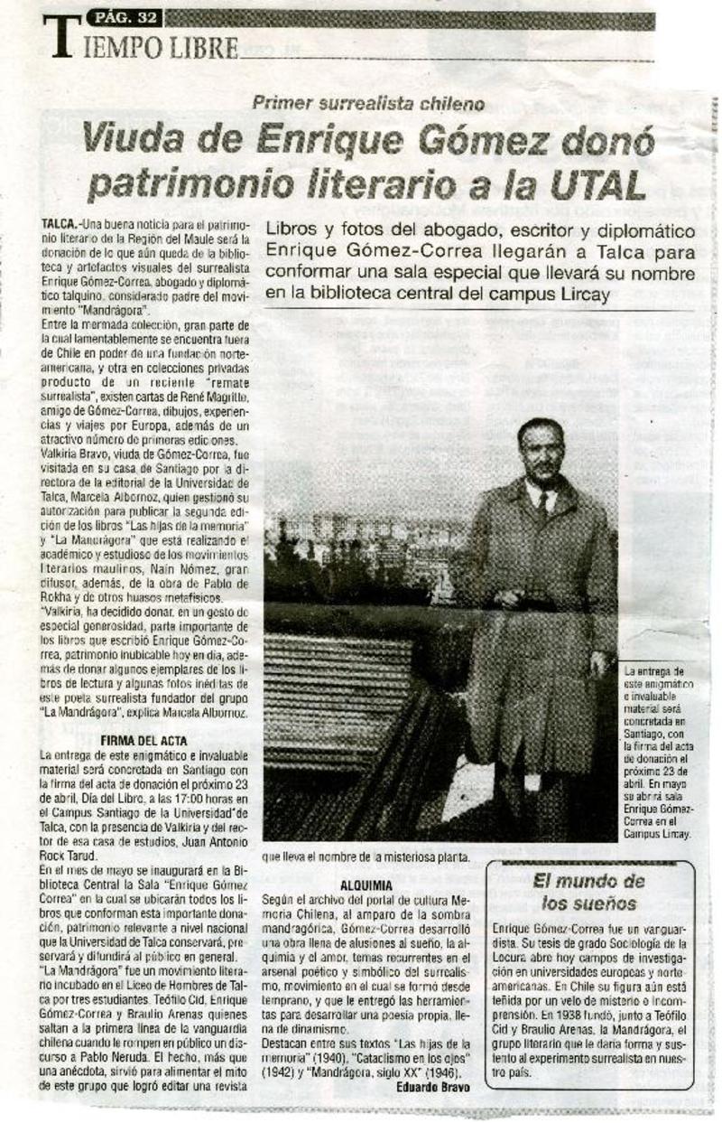 Viuda de Enrique Gómez donó parimonio literario d la UTAL [artículo]Eduardo Bravo.