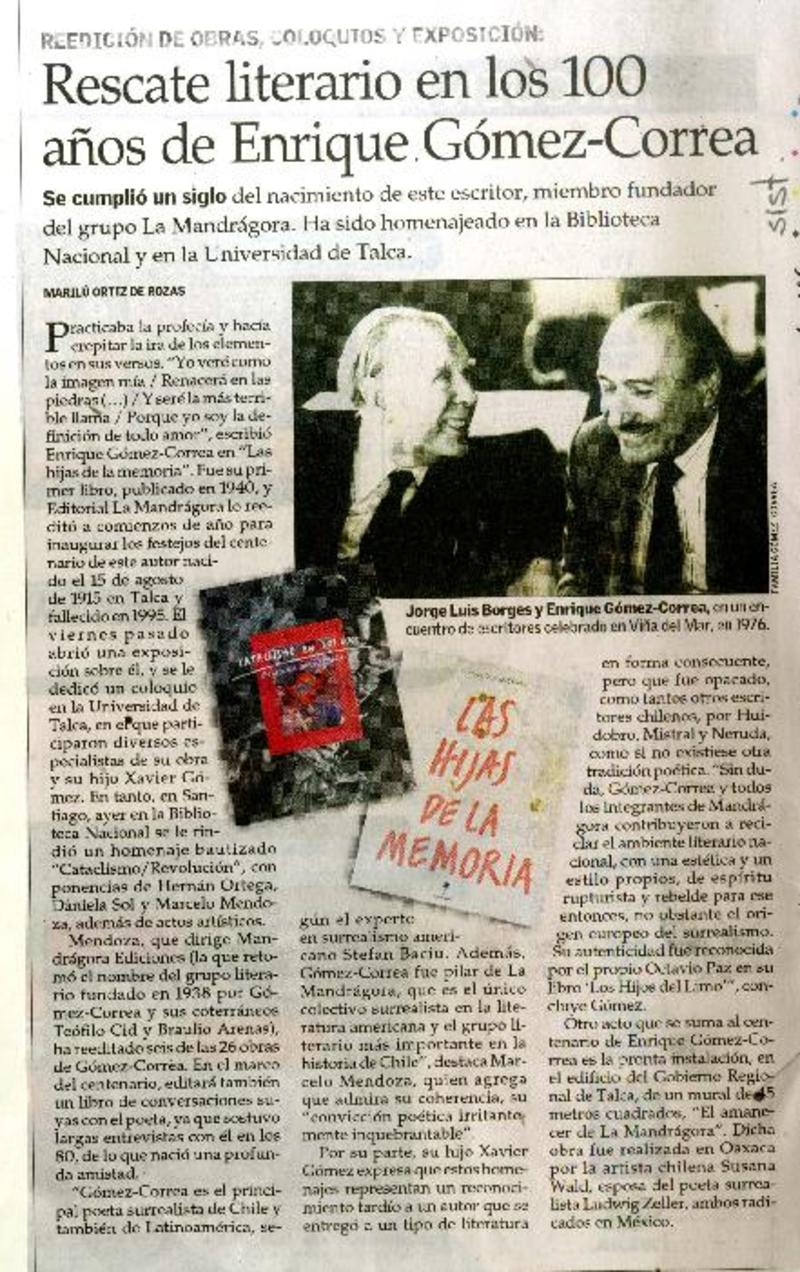 Rescate literario en los 100 años de Enrique Gómez-Correa [artículo] Marilú Ortiz de Rozas.