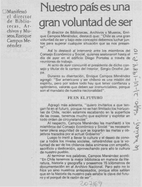 Chile y la voluntad de ser fue tema de cam pos Menéndez. [artículo]