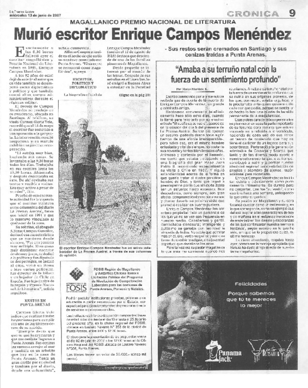 Premio Nacional de Literatura para Enrique Campos Menéndez [artículo].