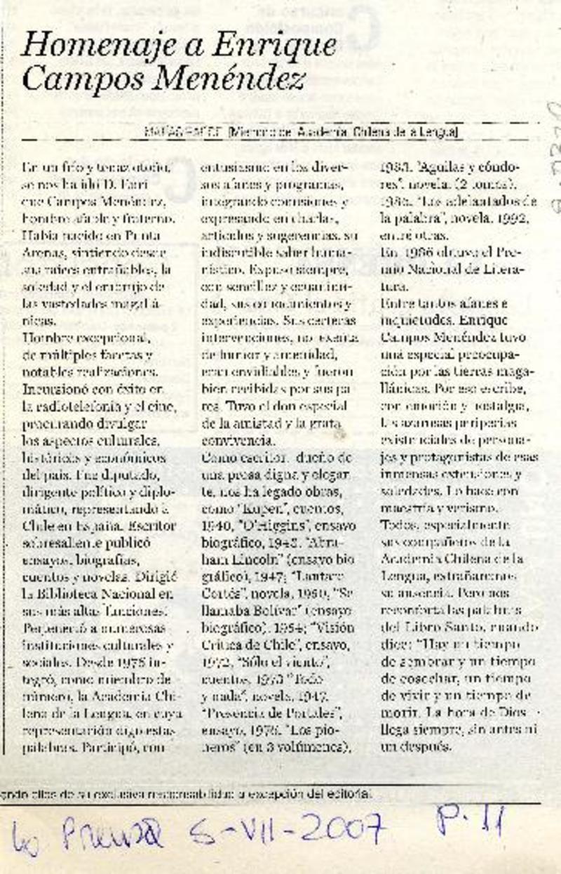 Academia de la Lengua incorpora al escritor Enrique Campos Menéndez. [artículo]