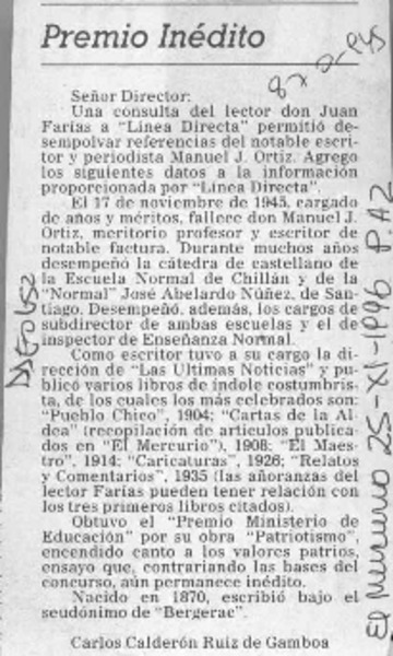 Premio inédito [artículo] Carlos Calderón Ruiz de Gamboa.