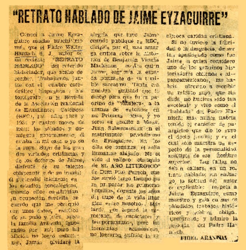 Retrato hablado de Jaime Eyzaguirre [artículo] Fidel Aranda.