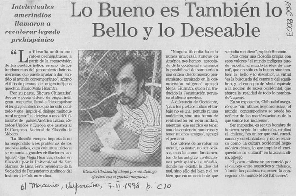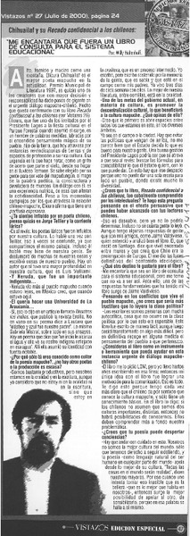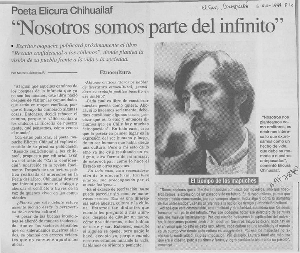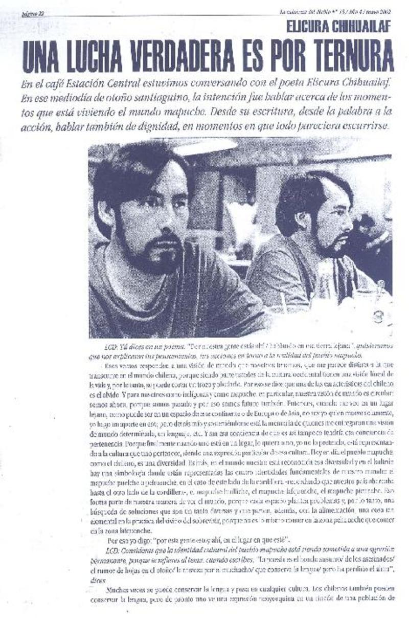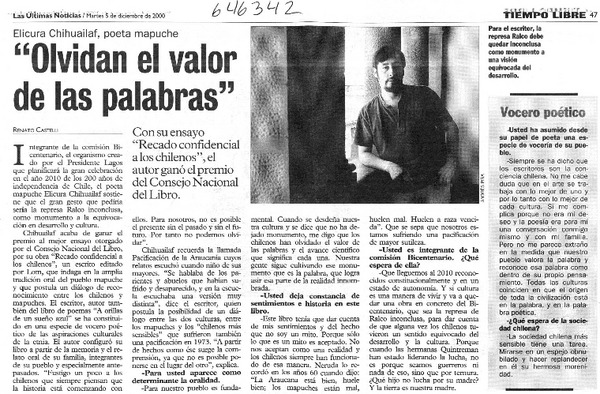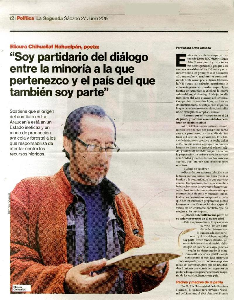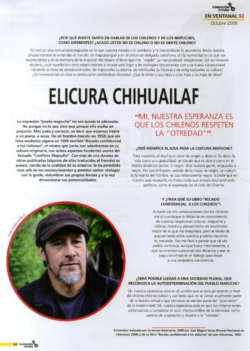 Elicura Chihuailaf, "Mi, nuestra esperanza es que los chilenos respeten la "otredad" [entrevista] [artículo] : José Miguel Varas.