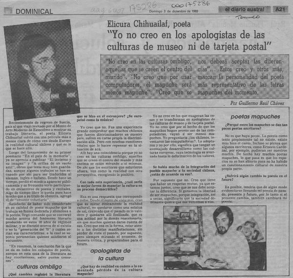 "Yo no creo en los apologistas de las culturas de museo ni de tarjeta postal" [artículo] Guillermo Raúl Chávez.