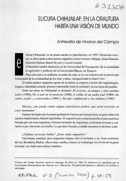 Elicura Chihuailaf, en la oralitura habita una visión de mundo [artículo] Viviana del Campo