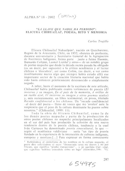 "La llave que nadie ha perdido", Elicura Chihuailaf, poesía, rito y memoria [artículo] Carlos Trujillo.