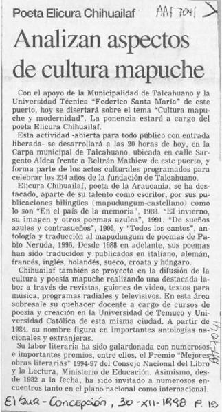 Analizan aspectos de cultura mapuche [artículo].