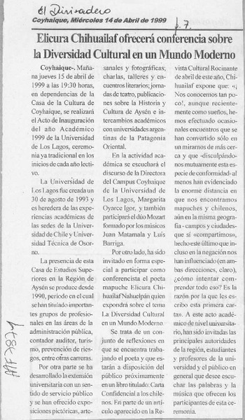 Elicura Chihuailaf ofrecerá conferencia sobre la diversidad cultural en un mundo moderno [artículo].