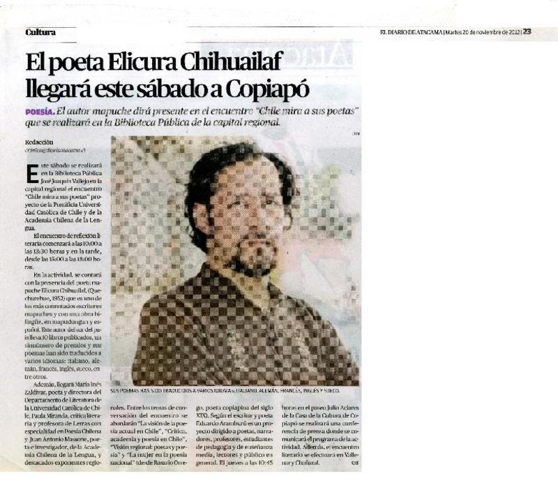 El poeta Elicura Chihuailaf llegará este sábado a Copiapó. [artículo]
