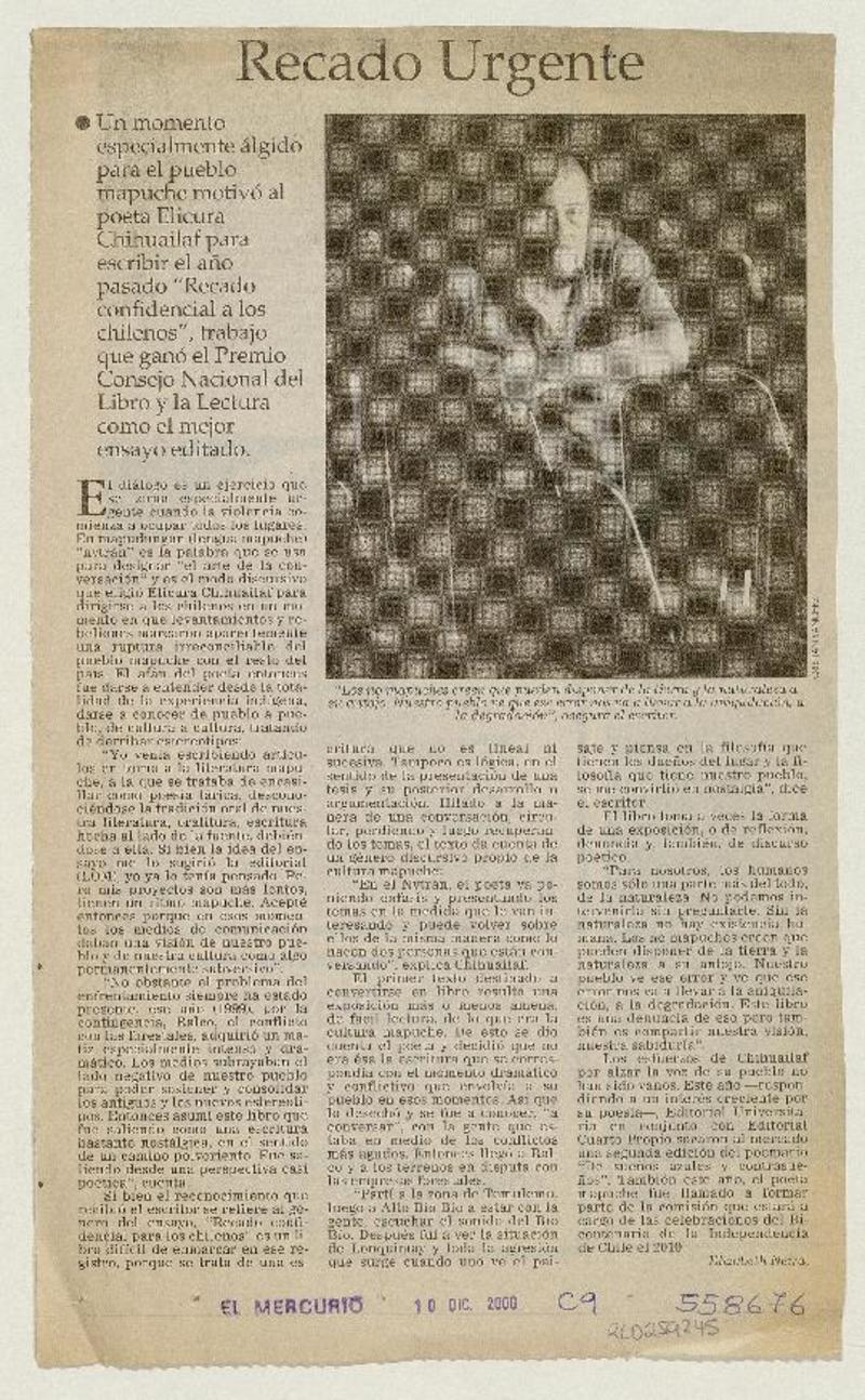 Recado confidencial de Elicura Chihuailaf [artículo] Lito Carrasco M.