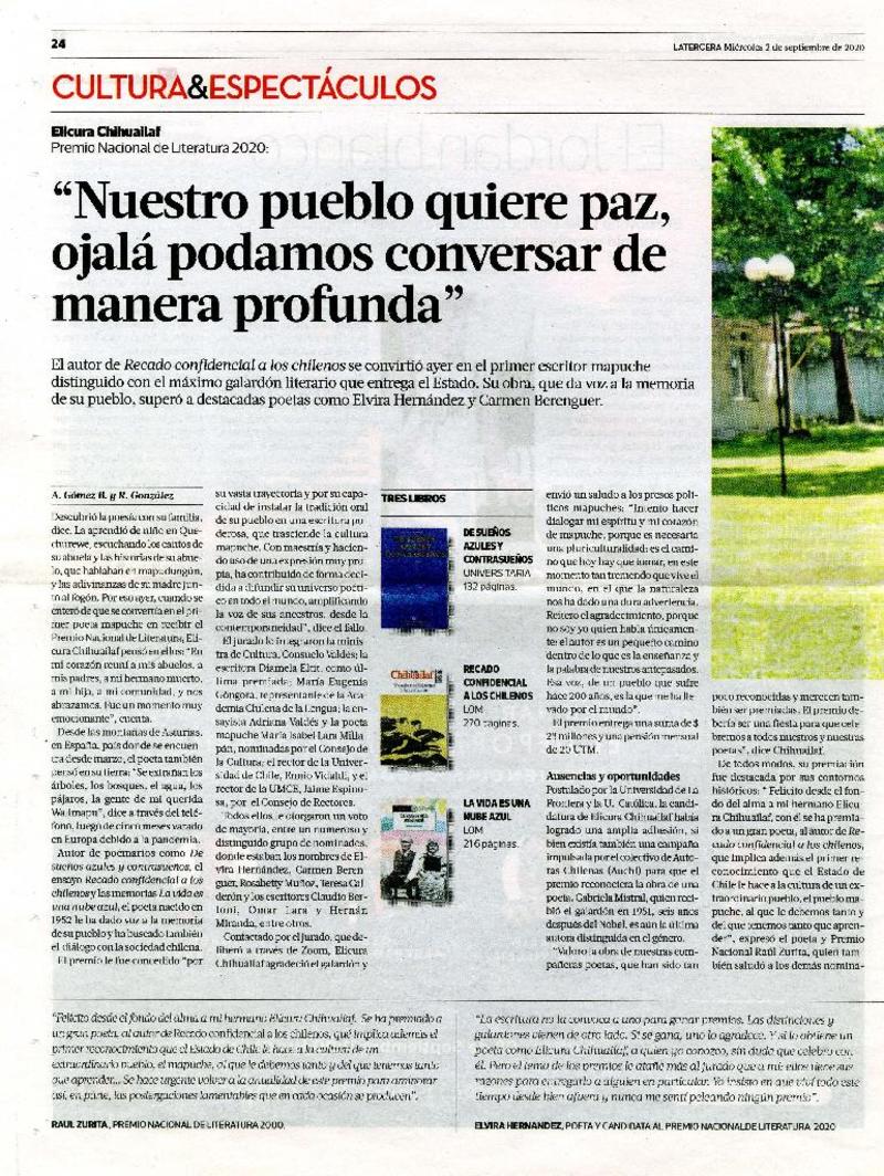 Elicura Chihuailaf, Premio Nacional de Literatura 2020 [artículo] Marcela V. Riedemann.