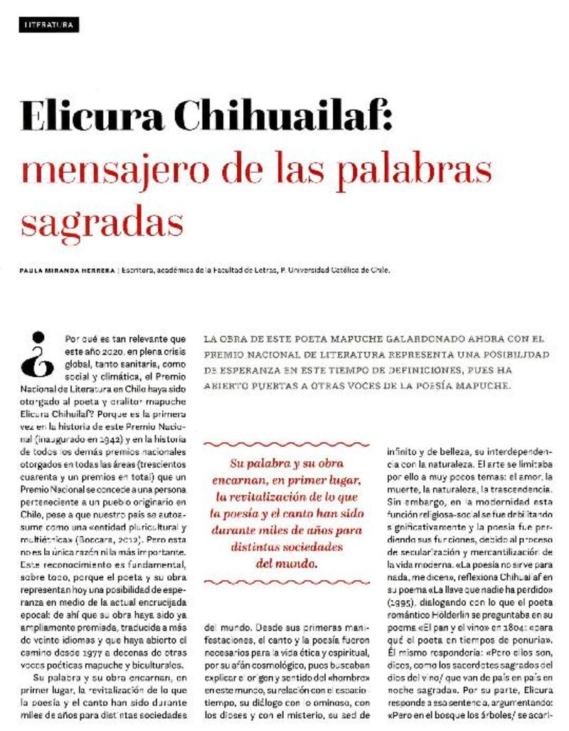 Elicura Chihuailaf : mensajero de las palabras sagradas [artículo] Paula Miranda Herrera.