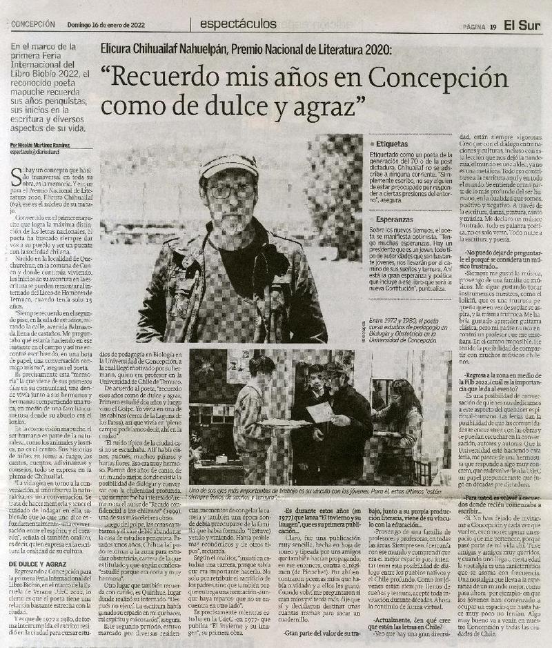 Elicura Chihuailaf Nahuelpán, premio nacional de Literatura 2020 : "Recuerdo mis años en Concepción como de dulce y agraz" [artículo] : Nicolás Martínez Ramírez.
